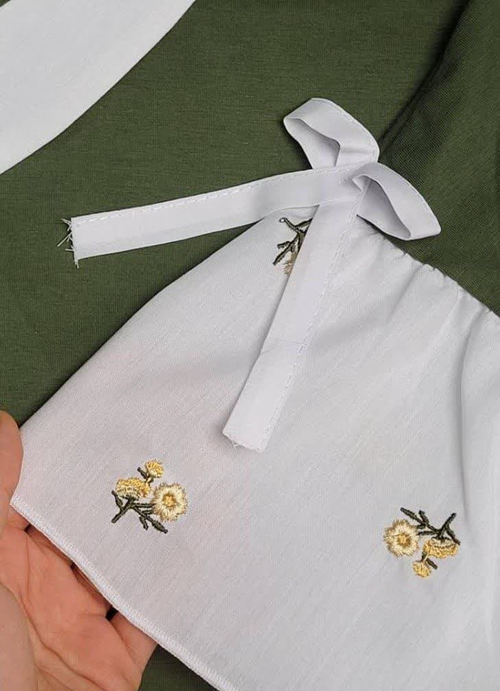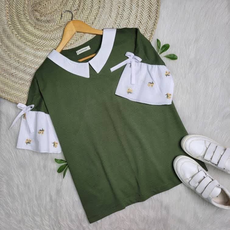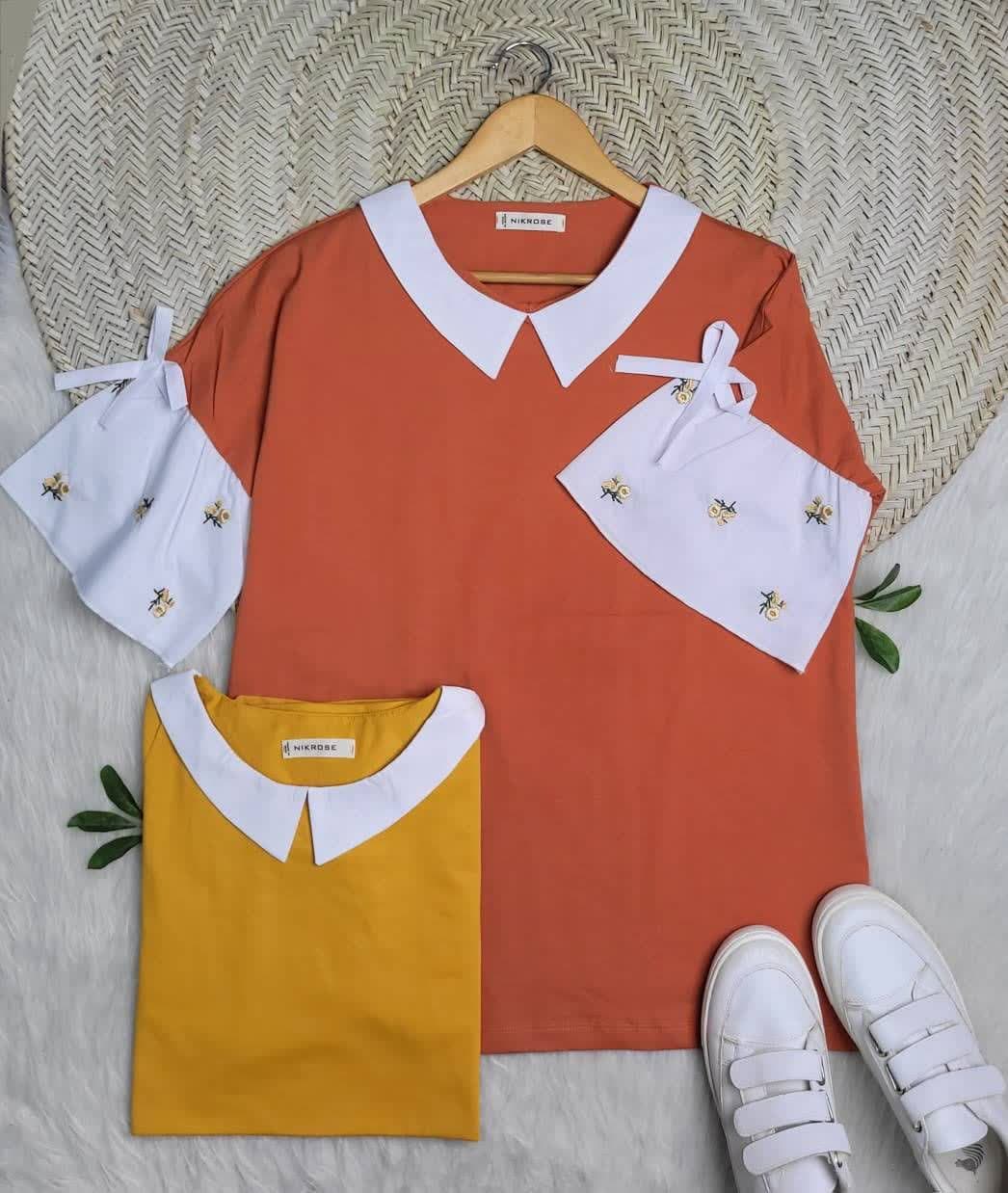 بلوز نخ پنبه، آستین کلوش، کشسانی کم، یقش و آستینش نخی نساجیه، گلدوزی ریز و ظریف.